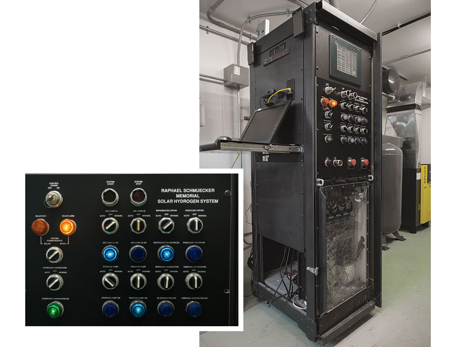 The controls and instrumentation assembly is located in the main system building. It controls the operation of the hydrogen and nitrogen generators, air compressors, air purification hardware; hydrogen, nitrogen, and mixed gas pumps, ammonia generation, and tractor hydrogen fueling. A display panel that shows system performance information can be monitored via the Internet.